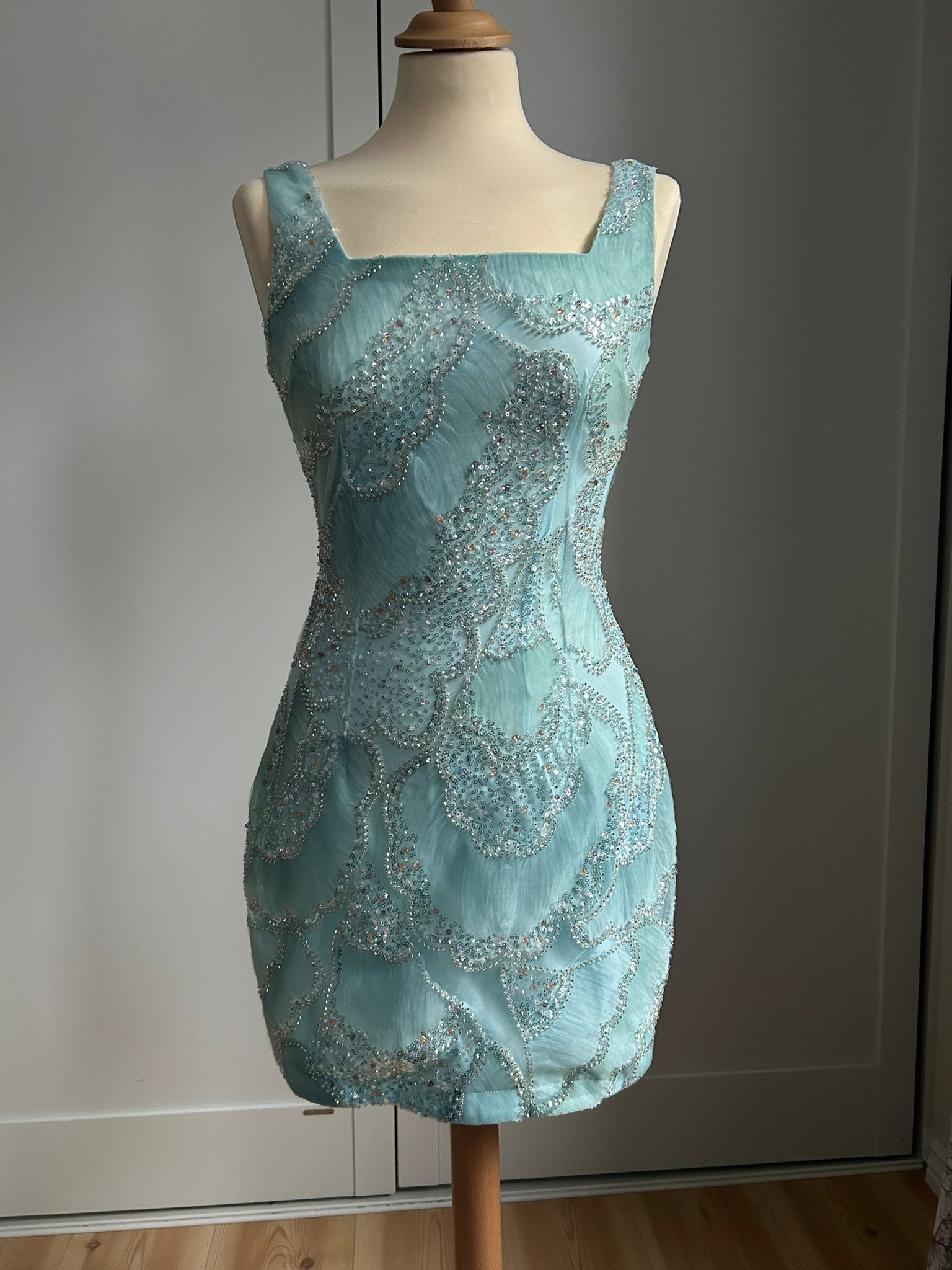 Aqua Veil Mini Dress is a luminous mini dress crafted in a soft aqua tone and adorned with flowing sequin embroidery that traces organic, wave-like patterns across the silhouette. The delicate shimmer creates an ethereal, veil-like effect that feels light and refined. Elegant yet modern, this dress is perfect for evening occasions, celebrations, or moments that call for subtle sparkle.