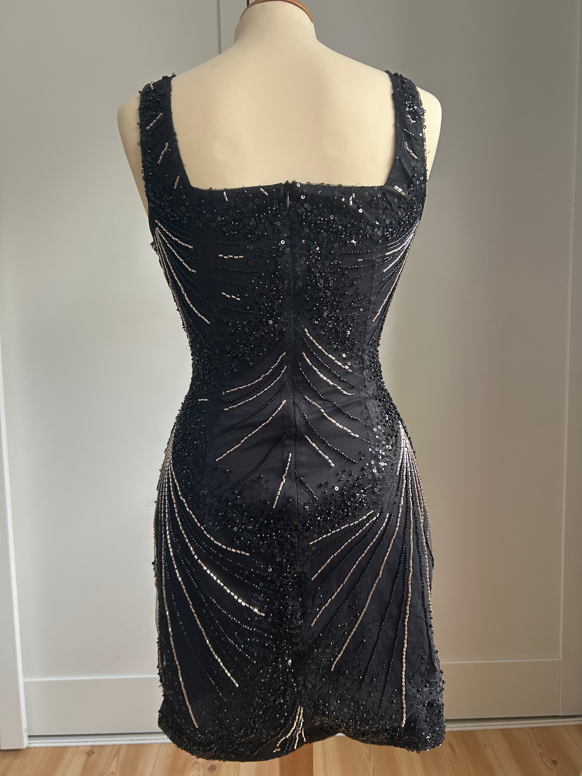 Black Starlight is an elegant mini dress designed in classic black, accented with radiating bead and sequin embroidery that glimmers like constellations. The structured pattern elongates the silhouette while adding a refined, celestial sparkle. Timeless yet striking, this piece is perfect for evening events, celebrations, and elevated after-dark looks.
