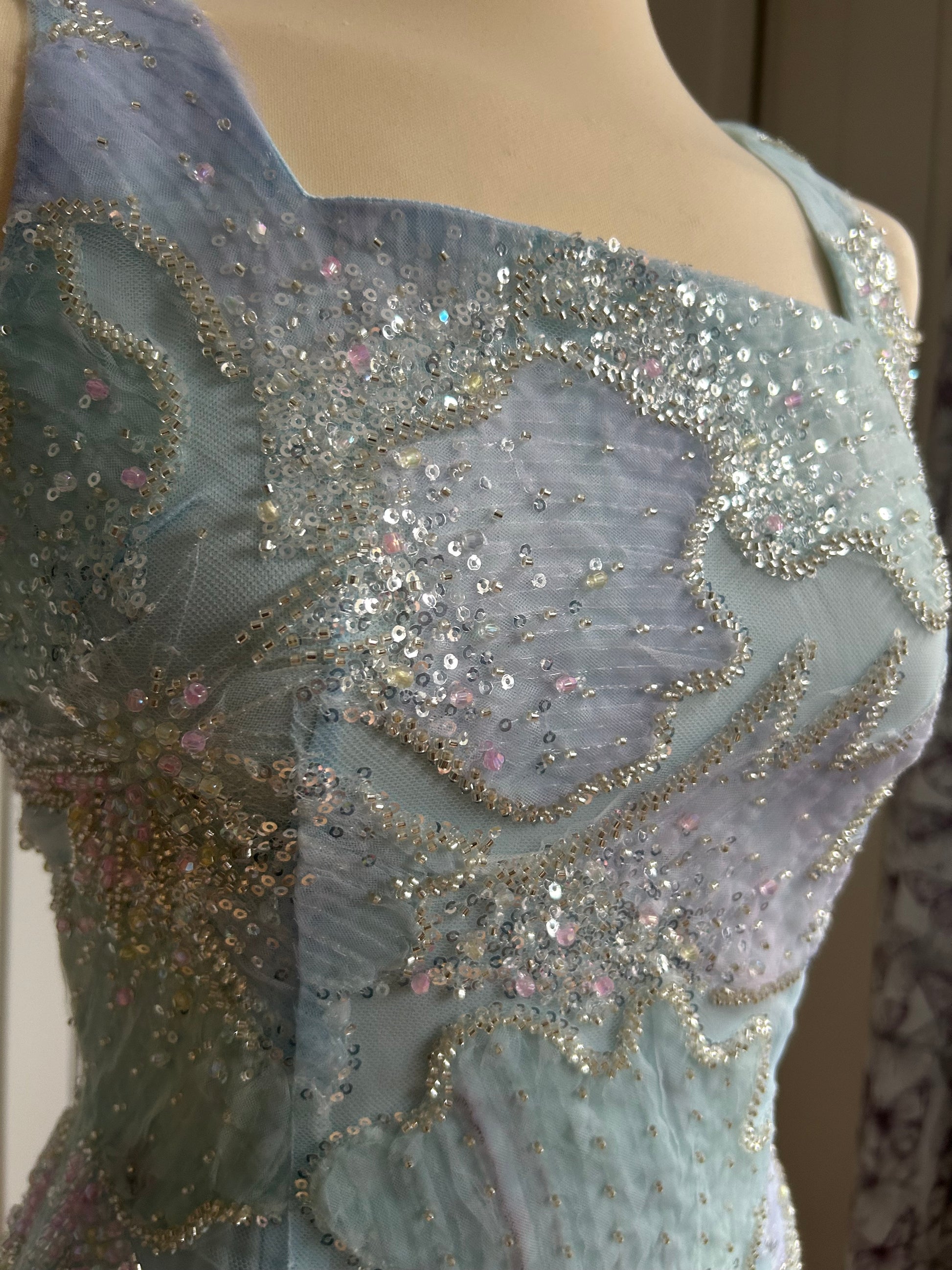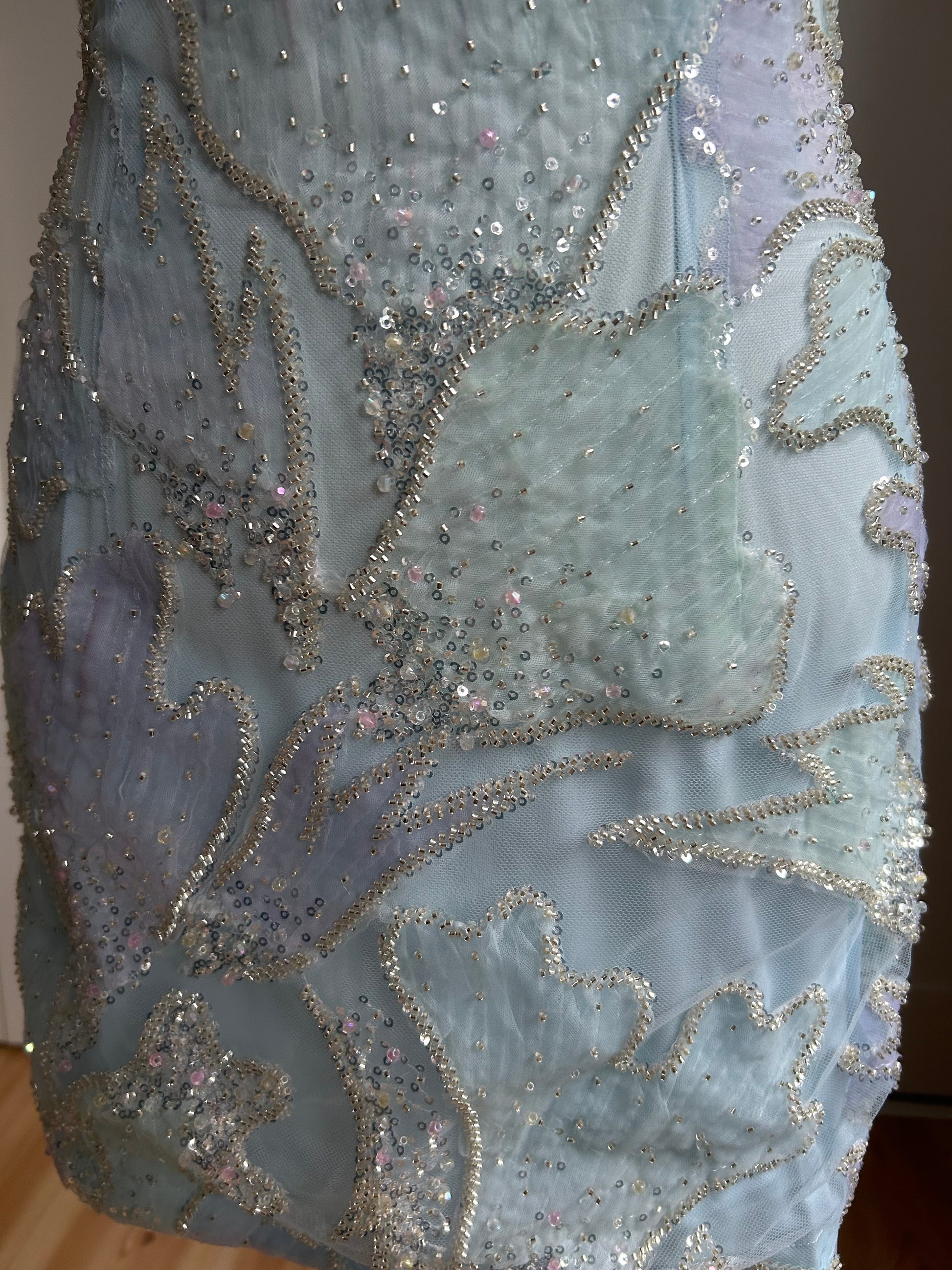 The Celeste Bloom Mini Dress is designed in a gentle blue hue with intricate floral-inspired embroidery that glows subtly under light. Elegant and feminine, this piece delivers a fresh, ethereal look while maintaining a sleek, flattering silhouette.