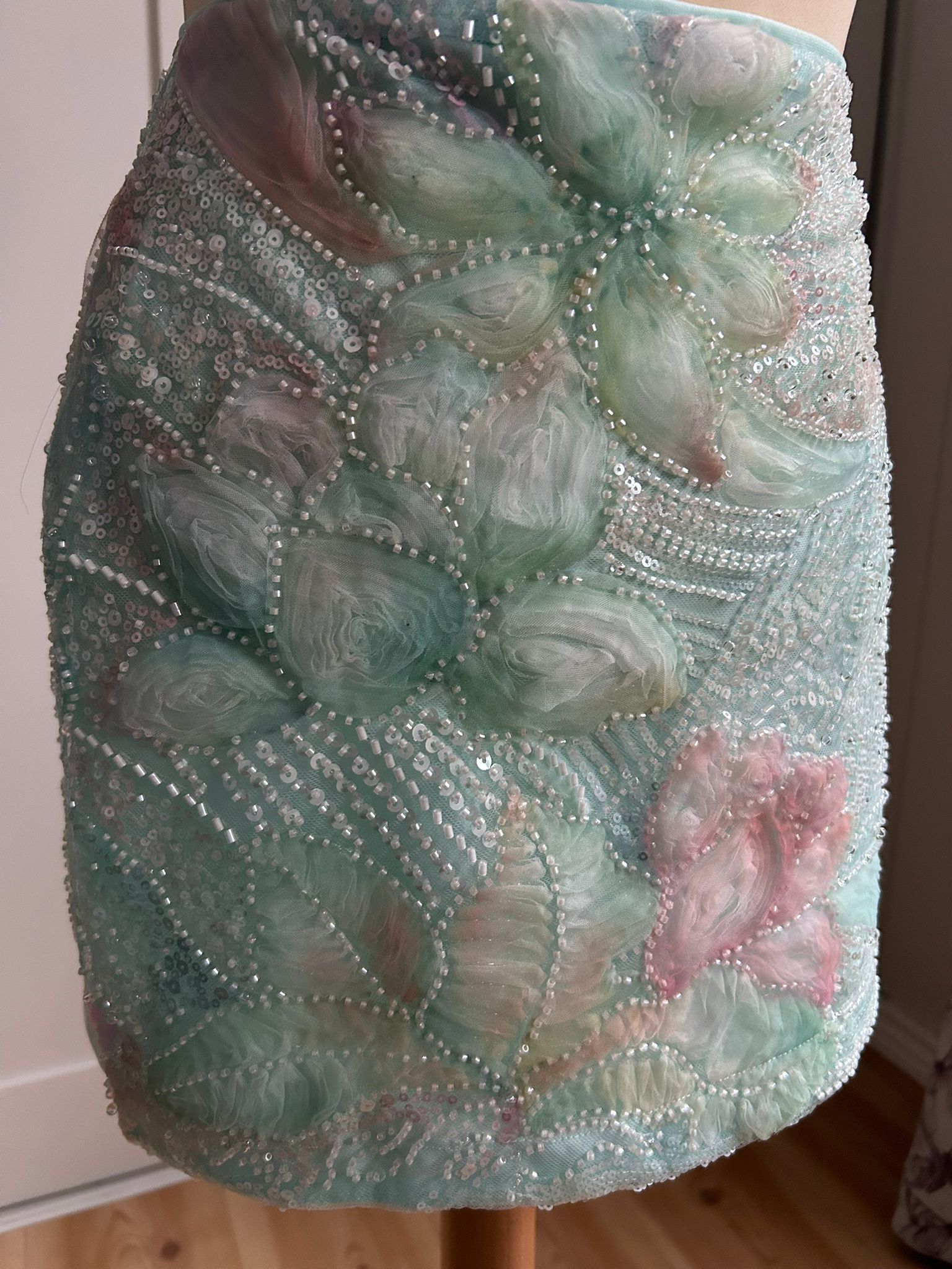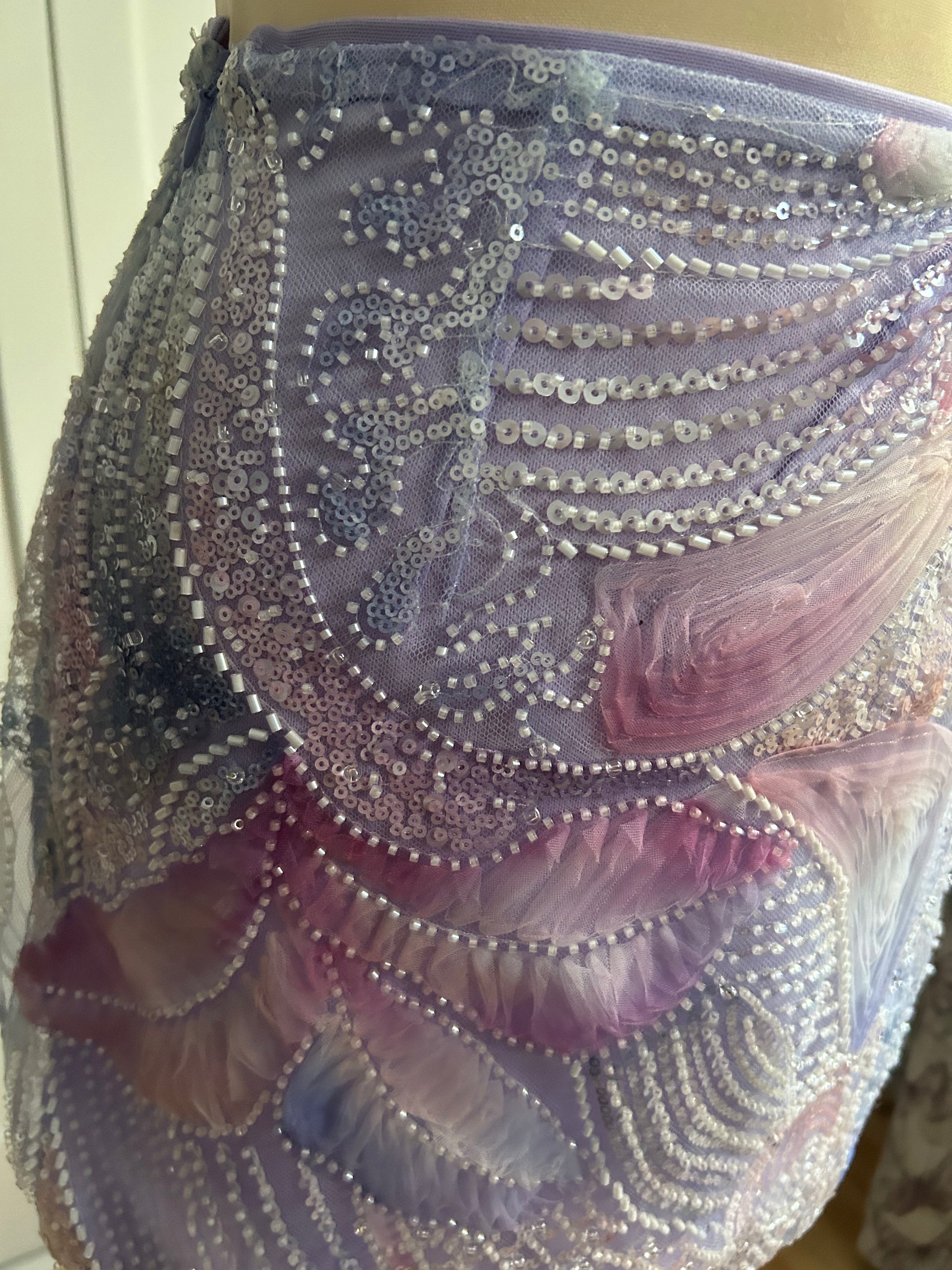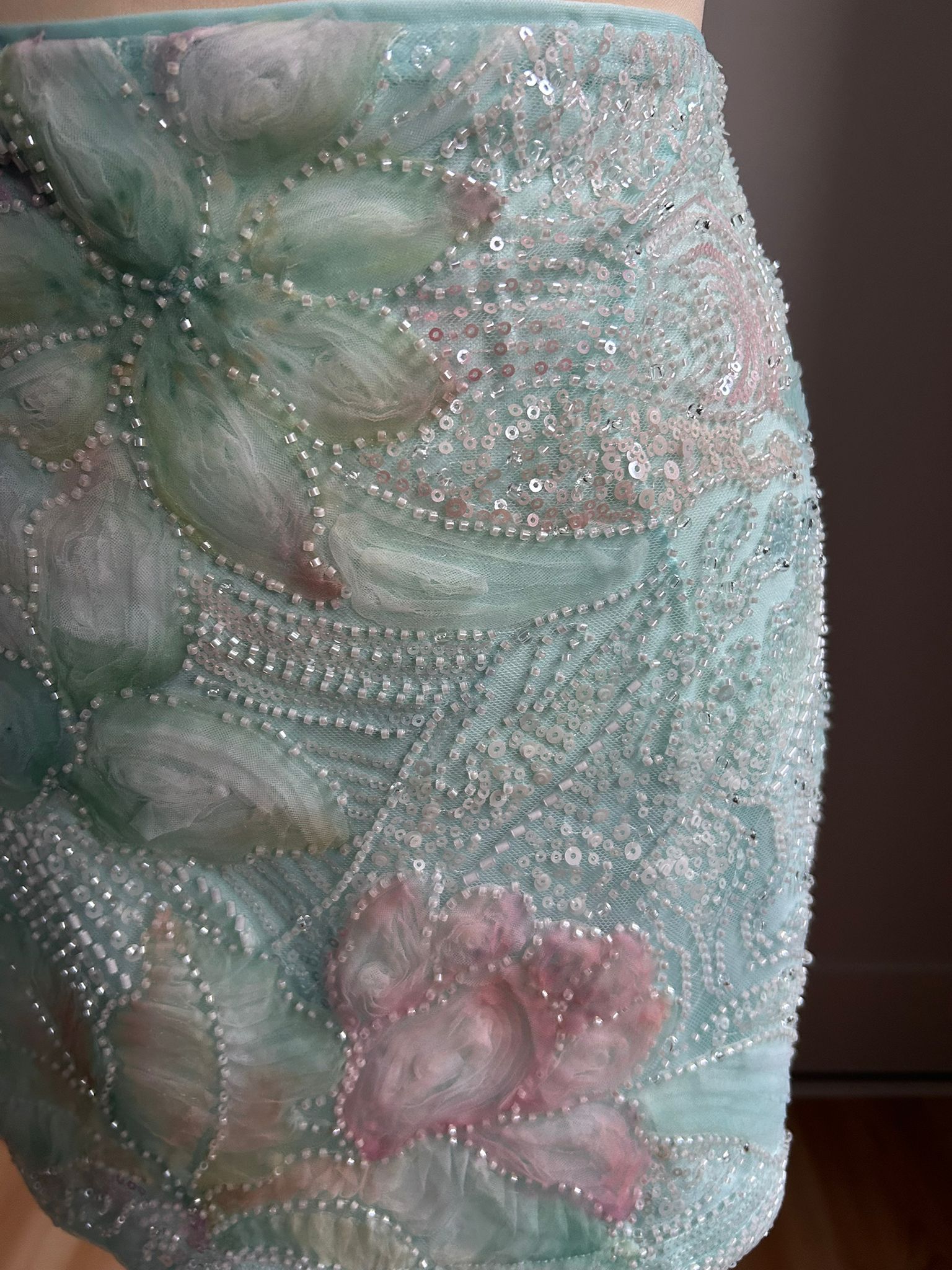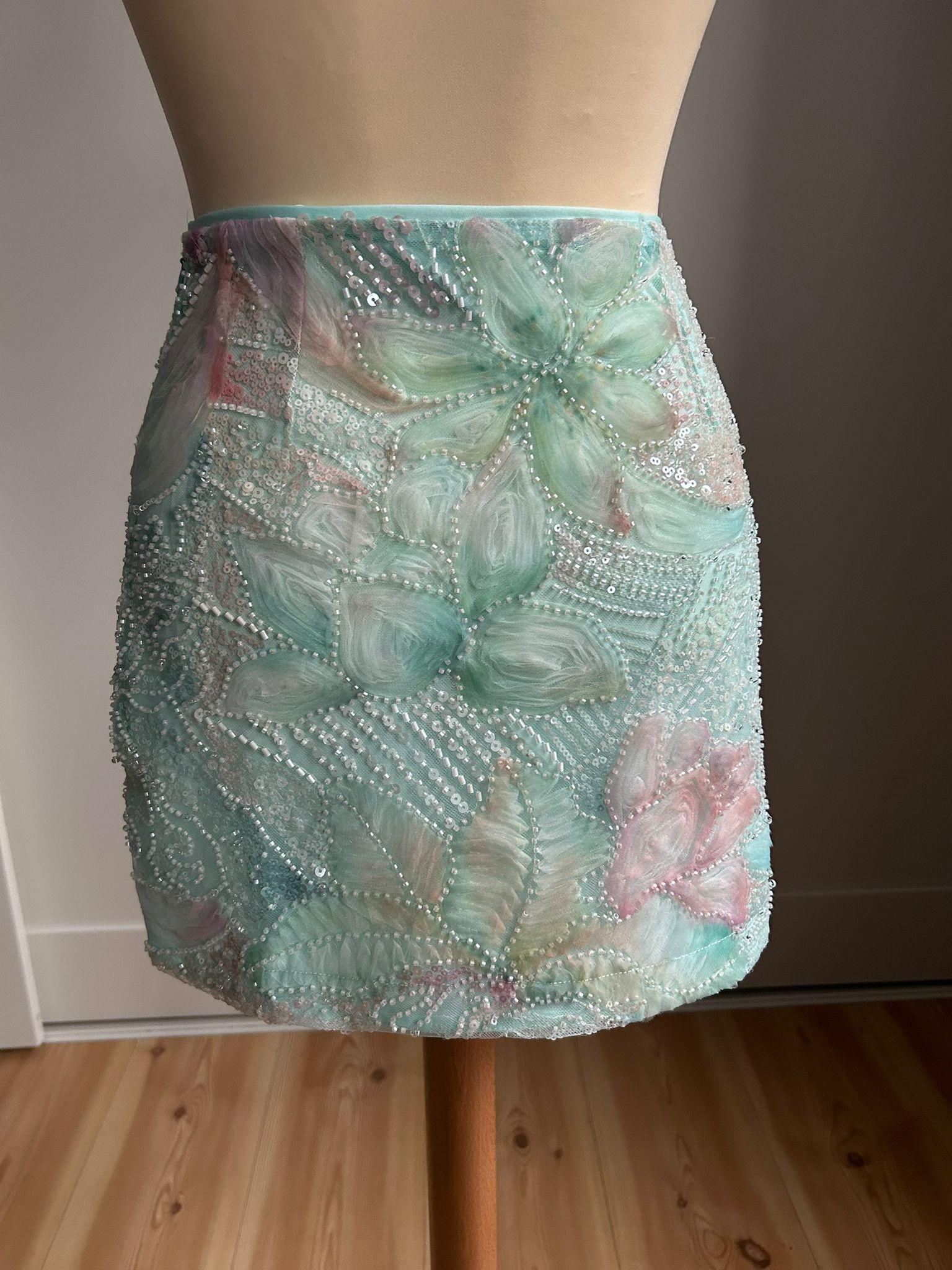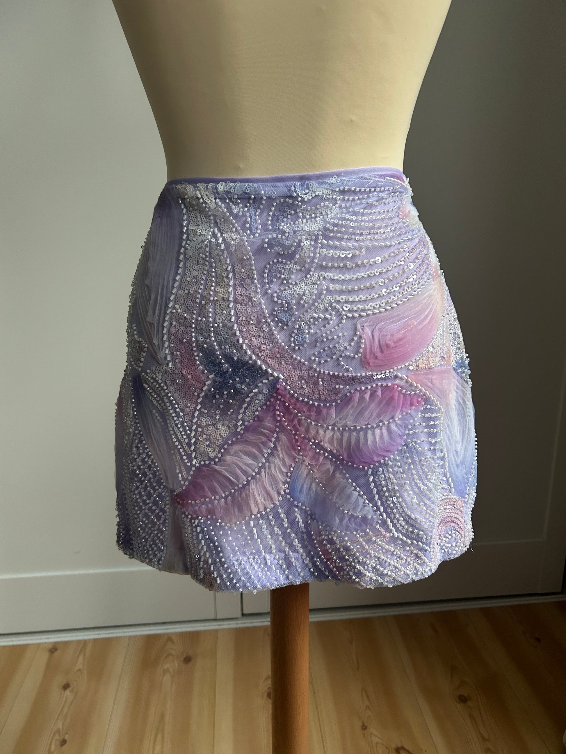 The Muse mini skirt features a delicate mesh base layered with hand-painted floral motifs and intricate sequin detailing that softly catches the light. Designed to sit high on the waist, it contours the body while maintaining a fluid, airy feel. Romantic and luminous, this piece blurs the line between art and wearability — made to feel special, intentional, and quietly striking.
