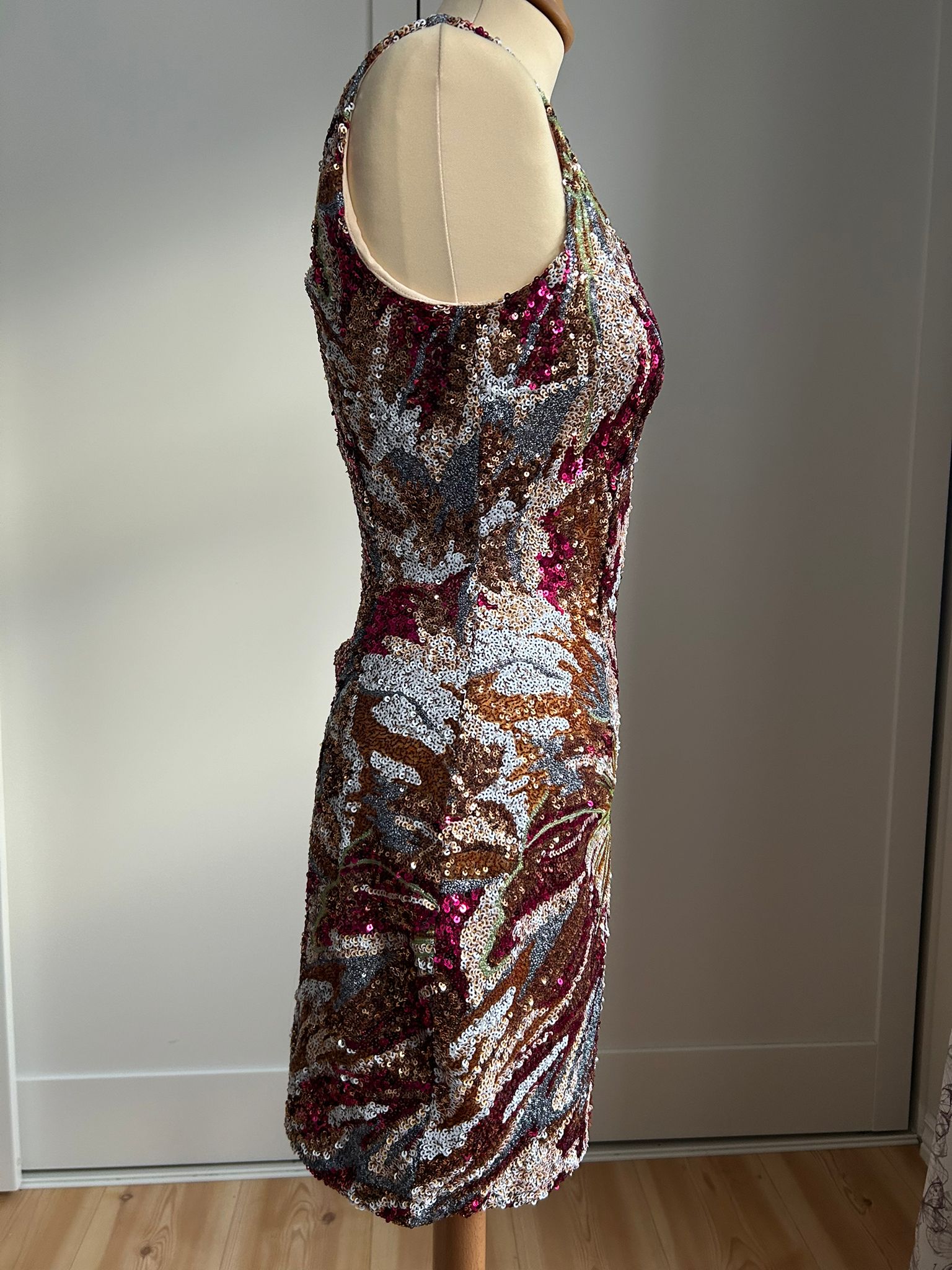 Wild Bloom is an expressive mini dress featuring a vibrant mix of gold, magenta, olive, and silver sequins arranged in a dramatic floral burst pattern. The rich color palette and shimmering texture create a bold, sculptural effect that feels both artistic and glamorous. Eye-catching and unapologetic, this dress is made for celebrations, evenings out, and standout moments.